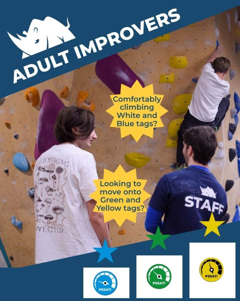 Our Adult Improver courses are designed to guide you through the first 3 intensity levels of our gym and get you feeling confident on the wall in general.